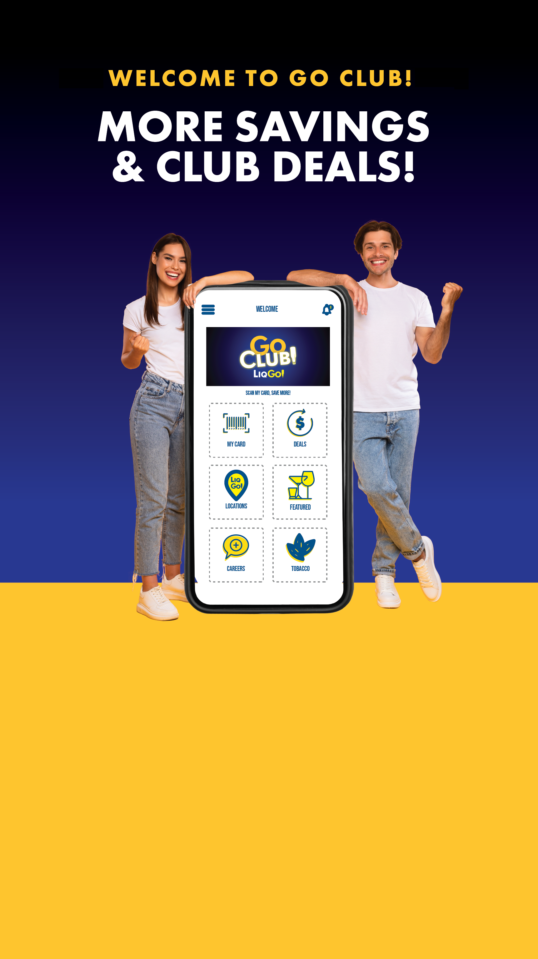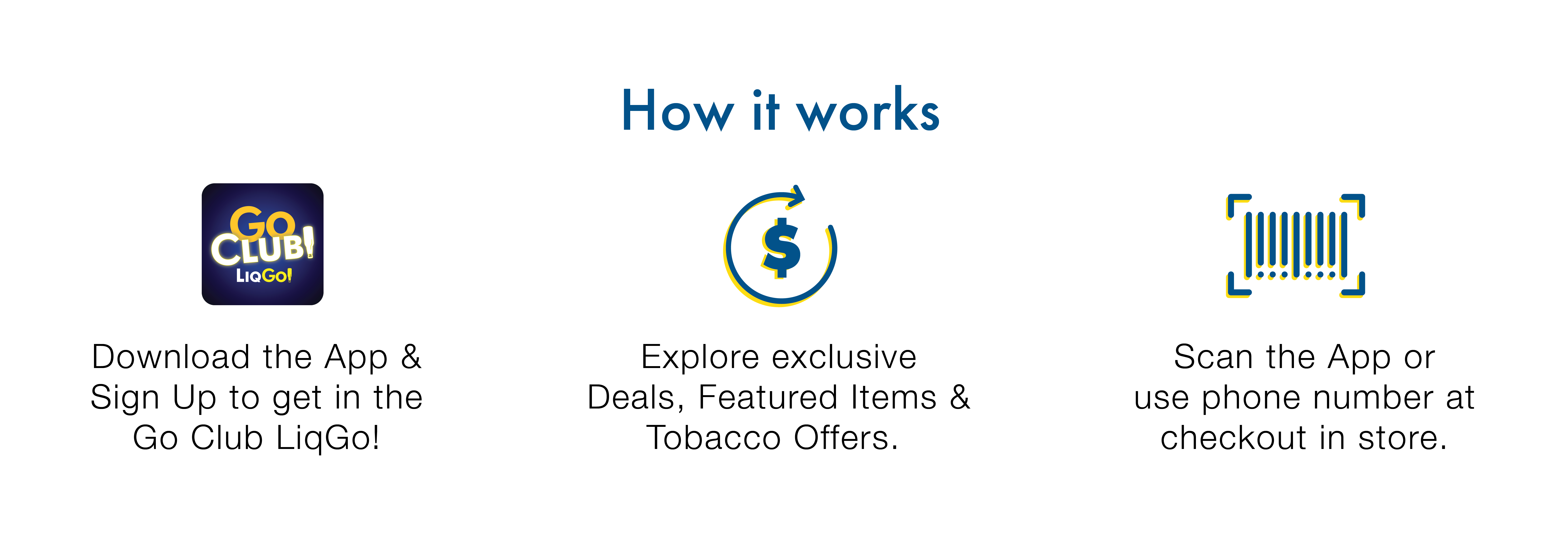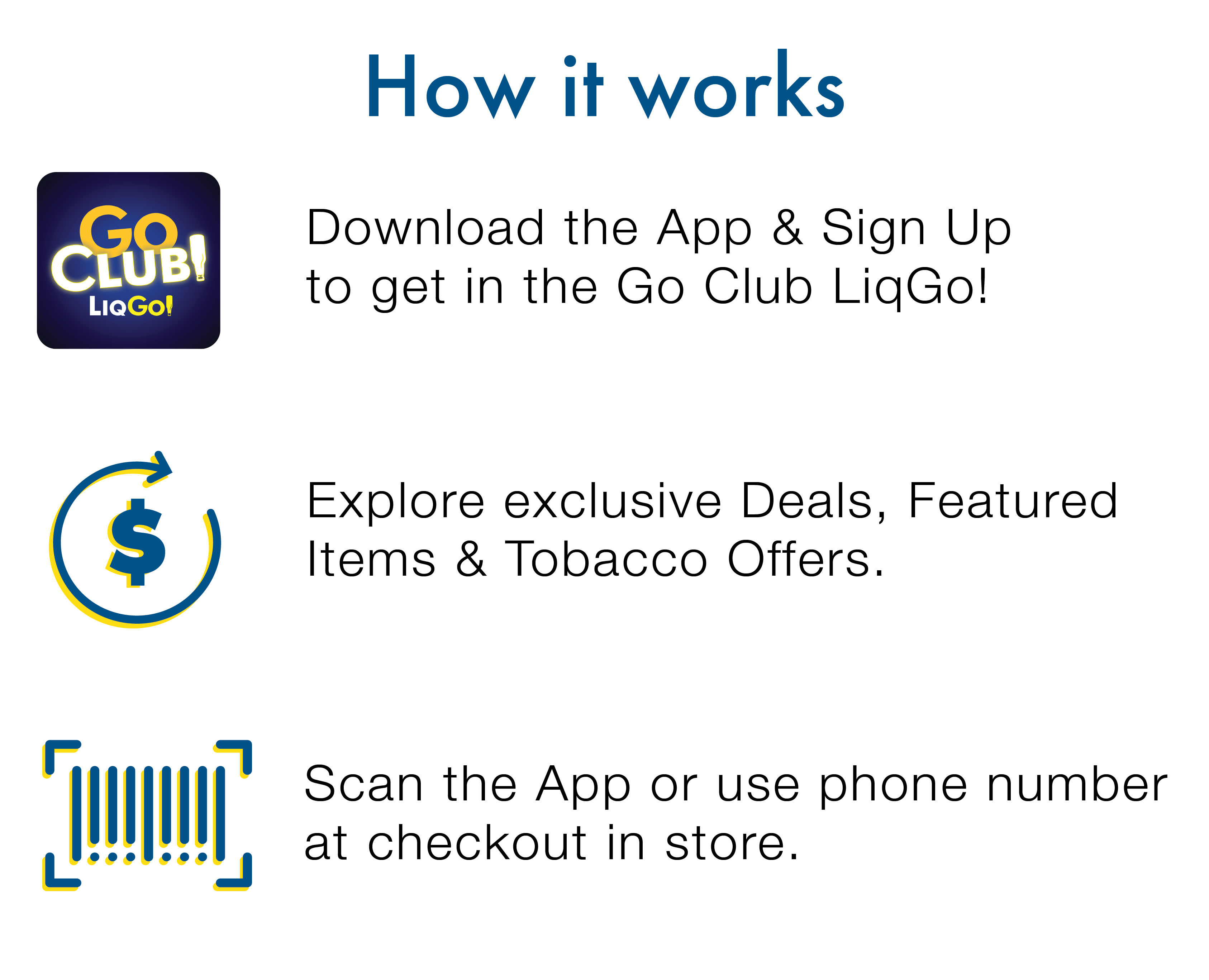 You can click the deals button in the app to view the offers available, look for the Go Club Liqgo! logo on advertisement in store or visit www.LiqGo.com/GoClub.